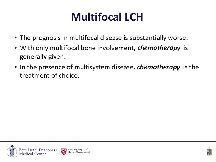 Multifocal LCH • The prognosis in multifocal disease is substantially worse. • With only multifocal bone involvement, chemotherapy is generally given. • In the presence of multisystem disease, chemotherapy is the treatment of choice.