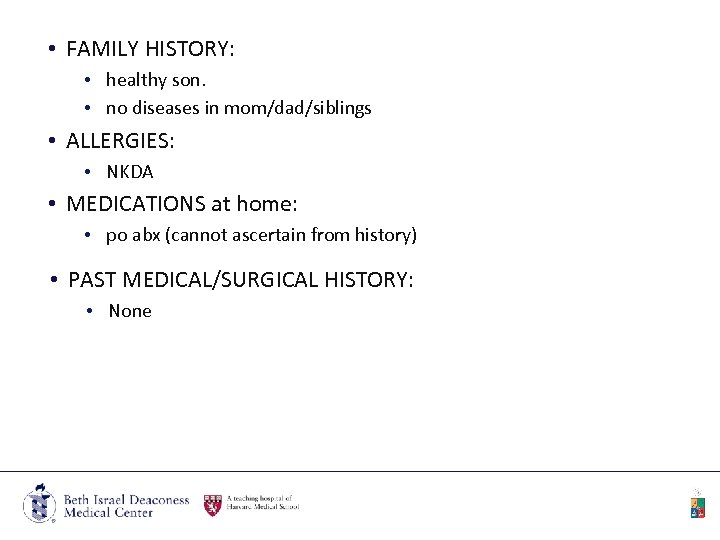 • FAMILY HISTORY: • healthy son. • no diseases in mom/dad/siblings • ALLERGIES: • NKDA • MEDICATIONS at home: • po abx (cannot ascertain from history) • PAST MEDICAL/SURGICAL HISTORY: • None