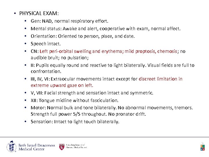 • PHYSICAL EXAM: • • • Gen: NAD, normal respiratory effort. Mental status: Awake and alert, cooperative with exam, normal affect. Orientation: Oriented to person, place, and date. Speech intact. CN: Left peri-orbital swelling and erythema; mild proptosis, chemosis; no audible bruit; no pulsation; II: Pupils equally round and reactive to light bilaterally. Visual fields are full to confrontation. III, IV, VI: Extraocular movements intact except for discreet limitation in extreme upward gaze on left. V, VII: Facial strength and sensation intact and symmetric. XII: Tongue midline without fasciculation. Motor: Normal bulk and tone bilaterally. No abnormal movements, tremors. Strength full power 5/5 throughout. No pronator drift. Sensation: Intact to light touch bilaterally.