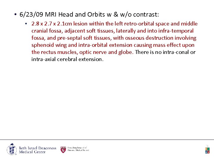• 6/23/09 MRI Head and Orbits w & w/o contrast: • 2. 8 x 2. 7 x 2. 1 cm lesion within the left retro-orbital space and middle cranial fossa, adjacent soft tissues, laterally and into infra-temporal fossa, and pre-septal soft tissues, with osseous destruction involving sphenoid wing and intra-orbital extension causing mass effect upon the rectus muscles, optic nerve and globe. There is no intra-conal or intra-axial cerebral extension.