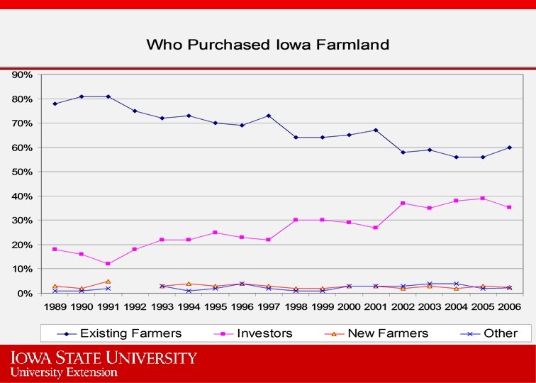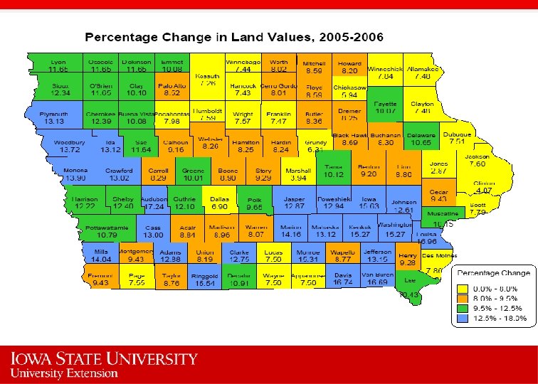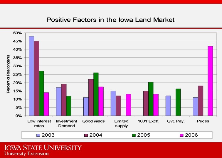 Factors to Watch • We are entering into a period of major uncertainty. How the ethanol situation will play out no one knows for sure. • Land values will move with higher income and anticipation • Are we setting ourselves up for another fall or is this a new plateau?