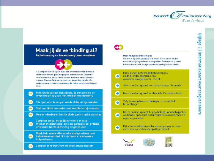 Waar moeten we heen? • Het verbinden van een keten dementie met het netwerk palliatieve zorg op organisatorisch en uitvoerend vlak. • Deskundigheidsbevordering van zorgmedewerkers op het gebied van palliatieve zorg bij mensen met dementie. • De keten dementie (geriatrie) en het netwerk palliatieve zorg hebben samenwerkingsafspraken. • Het consultatieteam palliatieve zorg en het casemanagement dementie hebben afspraken over expertise-uitwisseling en casuïstiek bespreking. • Laagdrempelige verwijzing en consultatie. PZ is integraal deel van dementiezorg (e. a. chronische ziekten)