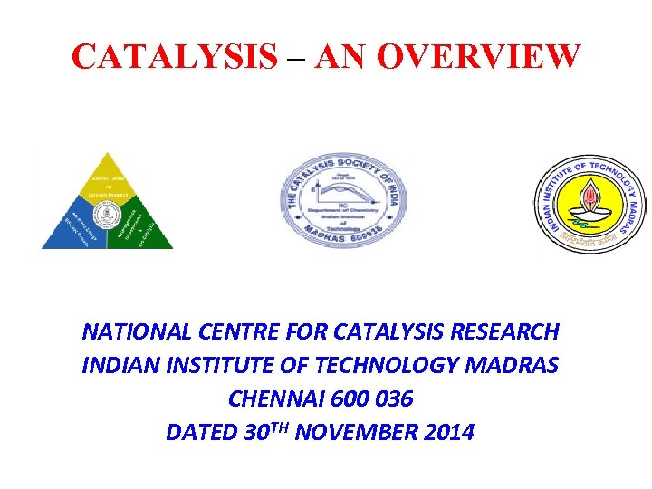 CATALYSIS – AN OVERVIEW NATIONAL CENTRE FOR CATALYSIS RESEARCH INDIAN INSTITUTE OF TECHNOLOGY MADRAS CHENNAI 600 036 DATED 30 TH NOVEMBER 2014