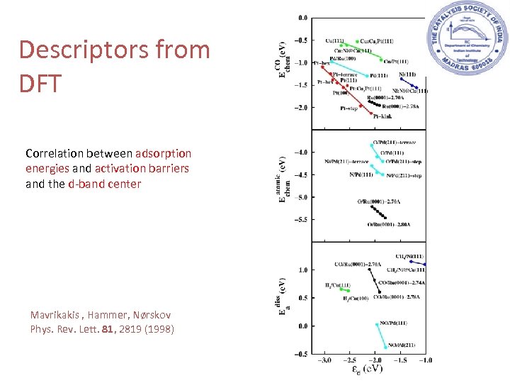 Descriptors from DFT Correlation between adsorption energies and activation barriers and the d-band center Mavrikakis , Hammer, Nørskov Phys. Rev. Lett. 81, 2819 (1998)