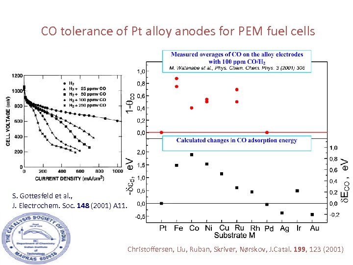CO tolerance of Pt alloy anodes for PEM fuel cells Pt M S. Gottesfeld et al. , J. Electrochem. Soc. 148 (2001) A 11. Christoffersen, Liu, Ruban, Skriver, Nørskov, J. Catal. 199, 123 (2001)