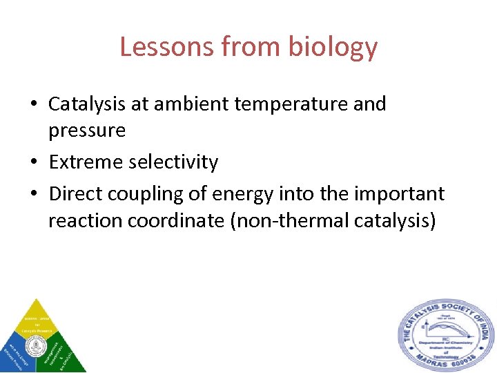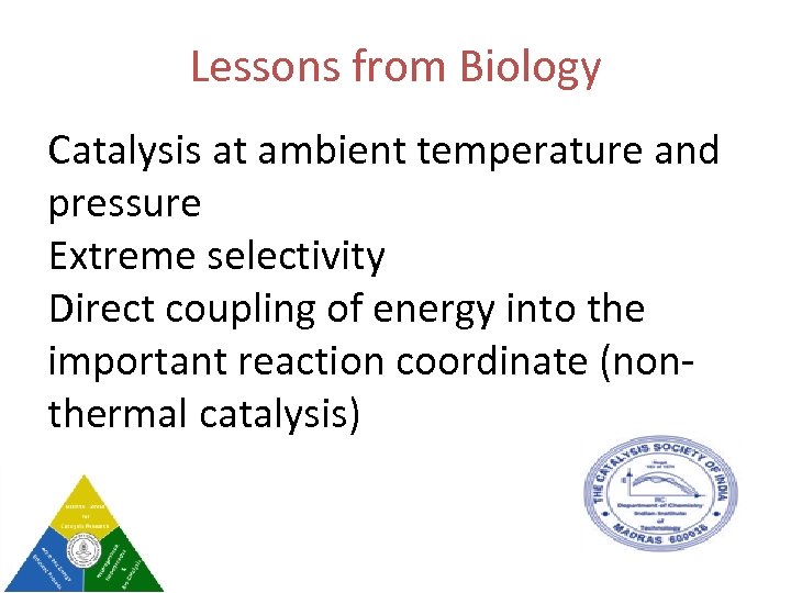 Lessons from Biology Catalysis at ambient temperature and pressure Extreme selectivity Direct coupling of energy into the important reaction coordinate (nonthermal catalysis)