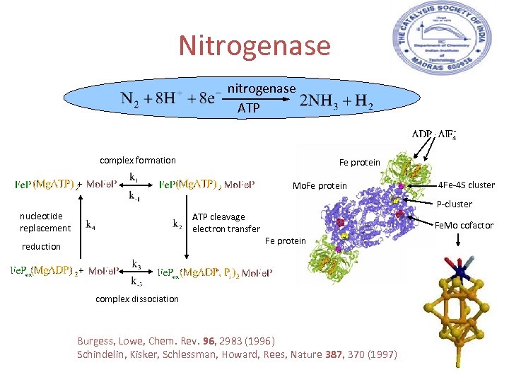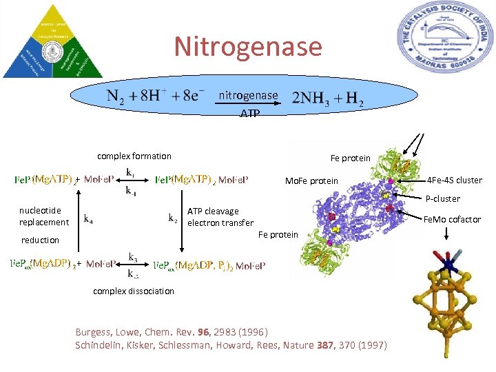 Nitrogenase nitrogenase ATP complex formation Fe protein + Mo. Fe protein 4 Fe-4 S cluster P-cluster nucleotide replacement ATP cleavage electron transfer reduction Fe. Mo cofactor Fe protein + complex dissociation Burgess, Lowe, Chem. Rev. 96, 2983 (1996) Schindelin, Kisker, Schlessman, Howard, Rees, Nature 387, 370 (1997)