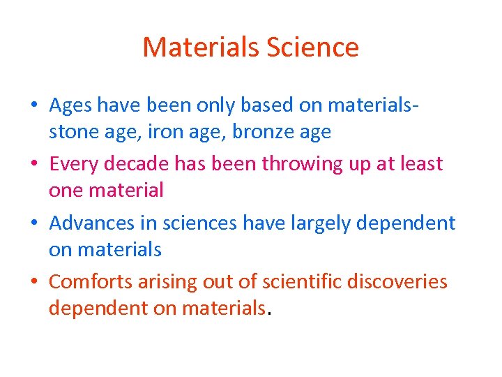 Materials Science • Ages have been only based on materials- stone age, iron age, bronze age • Every decade has been throwing up at least one material • Advances in sciences have largely dependent on materials • Comforts arising out of scientific discoveries dependent on materials.