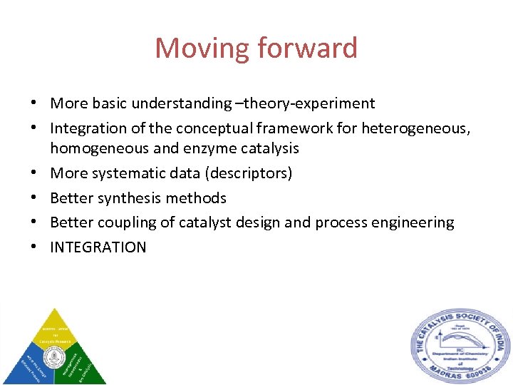 Moving forward • More basic understanding –theory-experiment • Integration of the conceptual framework for heterogeneous, homogeneous and enzyme catalysis • More systematic data (descriptors) • Better synthesis methods • Better coupling of catalyst design and process engineering • INTEGRATION