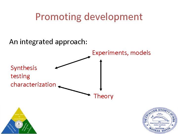 Promoting development An integrated approach: Experiments, models Synthesis testing characterization Theory