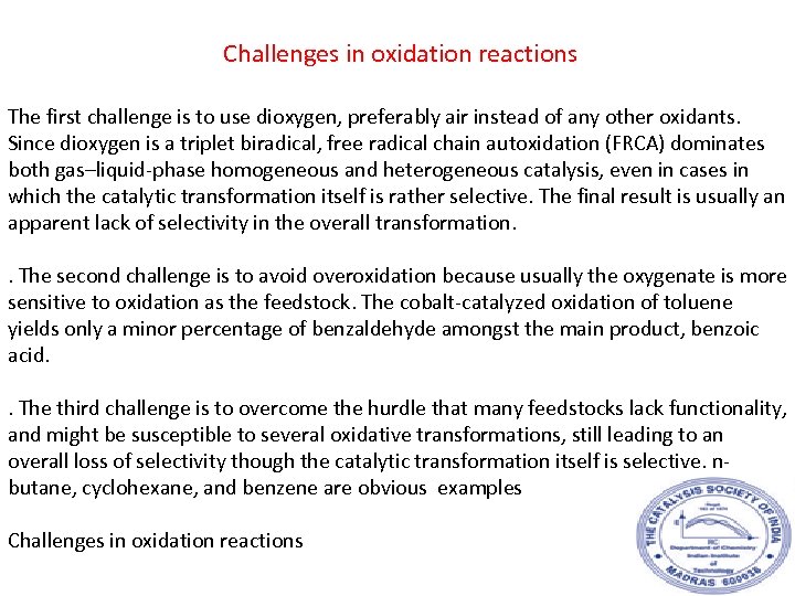 Challenges in oxidation reactions The first challenge is to use dioxygen, preferably air instead of any other oxidants. Since dioxygen is a triplet biradical, free radical chain autoxidation (FRCA) dominates both gas–liquid-phase homogeneous and heterogeneous catalysis, even in cases in which the catalytic transformation itself is rather selective. The final result is usually an apparent lack of selectivity in the overall transformation. . The second challenge is to avoid overoxidation because usually the oxygenate is more sensitive to oxidation as the feedstock. The cobalt-catalyzed oxidation of toluene yields only a minor percentage of benzaldehyde amongst the main product, benzoic acid. . The third challenge is to overcome the hurdle that many feedstocks lack functionality, and might be susceptible to several oxidative transformations, still leading to an overall loss of selectivity though the catalytic transformation itself is selective. nbutane, cyclohexane, and benzene are obvious examples Challenges in oxidation reactions