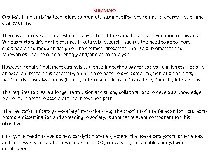 SUMMARY Catalysis in an enabling technology to promote sustainability, environment, energy, health and quality of life. There is an increase of interest on catalysis, but at the same time a fast evolution of this area. Various factors driving the changes in catalysis research , such as the need to go to more sustainable and modular-design of the chemical processes, the use of biomasses and renewables, the use of solar energy and/or electro-catalysis. However, to fully implement catalysis as a enabling technology for societal challenges, not only an excellent research is necessary, but it is also need to overcome fragmentation barriers, particularly in catalysis areas (homo-, hetero- and bio-) and in academy–industry interactions. This requires to create a longer term vision and strong collaborations to develop a knowledge platform, in order to accelerate the innovation path. The realization of catalysis–society interactions, e. g. the creation of interfaces and structures to promote dissemination and spreading to society, is another relevant component for this objective. Finally, the need to develop new catalytic materials, extend the use of catalysts to other areas, and address key societal issues (for example CO 2 conversion, sustainable energy) were emphasized.
