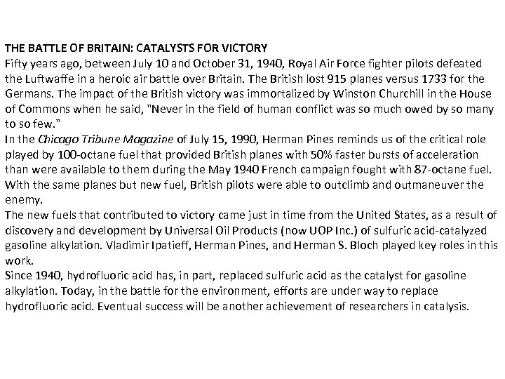 THE BATTLE OF BRITAIN: CATALYSTS FOR VICTORY Fifty years ago, between July 10 and October 31, 1940, Royal Air Force fighter pilots defeated the Luftwaffe in a heroic air battle over Britain. The British lost 915 planes versus 1733 for the Germans. The impact of the British victory was immortalized by Winston Churchill in the House of Commons when he said, "Never in the field of human conflict was so much owed by so many to so few. " In the Chicago Tribune Magazine of July 15, 1990, Herman Pines reminds us of the critical role played by 100 -octane fuel that provided British planes with 50% faster bursts of acceleration than were available to them during the May 1940 French campaign fought with 87 -octane fuel. With the same planes but new fuel, British pilots were able to outclimb and outmaneuver the enemy. The new fuels that contributed to victory came just in time from the United States, as a result of discovery and development by Universal Oil Products (now UOP Inc. ) of sulfuric acid-catalyzed gasoline alkylation. Vladimir Ipatieff, Herman Pines, and Herman S. Bloch played key roles in this work. Since 1940, hydrofluoric acid has, in part, replaced sulfuric acid as the catalyst for gasoline alkylation. Today, in the battle for the environment, efforts are under way to replace hydrofluoric acid. Eventual success will be another achievement of researchers in catalysis.
