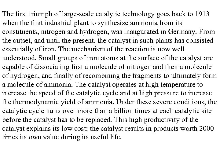 The first triumph of large-scale catalytic technology goes back to 1913 when the first industrial plant to synthesize ammonia from its constituents, nitrogen and hydrogen, was inaugurated in Germany. From the outset, and until the present, the catalyst in such plants has consisted essentially of iron. The mechanism of the reaction is now well understood. Small groups of iron atoms at the surface of the catalyst are capable of dissociating first a molecule of nitrogen and then a molecule of hydrogen, and finally of recombining the fragments to ultimately form a molecule of ammonia. The catalyst operates at high temperature to increase the speed of the catalytic cycle and at high pressure to increase thermodynamic yield of ammonia. Under these severe conditions, the catalytic cycle turns over more than a billion times at each catalytic site before the catalyst has to be replaced. This high productivity of the catalyst explains its low cost: the catalyst results in products worth 2000 times its own value during its useful life.
