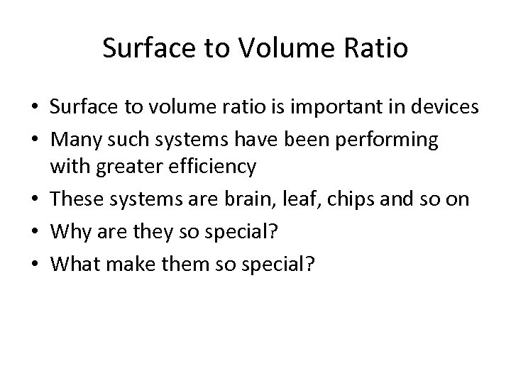 Surface to Volume Ratio • Surface to volume ratio is important in devices • Many such systems have been performing with greater efficiency • These systems are brain, leaf, chips and so on • Why are they so special? • What make them so special?