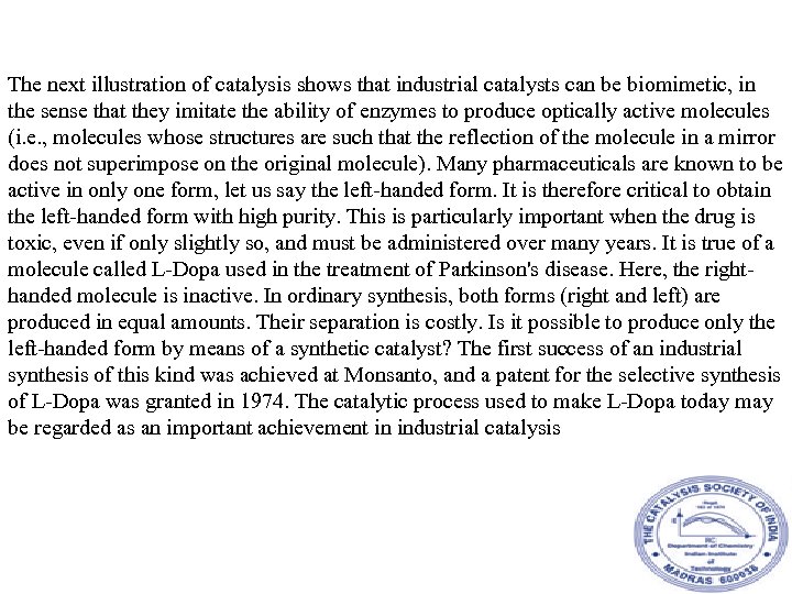 The next illustration of catalysis shows that industrial catalysts can be biomimetic, in the sense that they imitate the ability of enzymes to produce optically active molecules (i. e. , molecules whose structures are such that the reflection of the molecule in a mirror does not superimpose on the original molecule). Many pharmaceuticals are known to be active in only one form, let us say the left-handed form. It is therefore critical to obtain the left-handed form with high purity. This is particularly important when the drug is toxic, even if only slightly so, and must be administered over many years. It is true of a molecule called L-Dopa used in the treatment of Parkinson's disease. Here, the righthanded molecule is inactive. In ordinary synthesis, both forms (right and left) are produced in equal amounts. Their separation is costly. Is it possible to produce only the left-handed form by means of a synthetic catalyst? The first success of an industrial synthesis of this kind was achieved at Monsanto, and a patent for the selective synthesis of L-Dopa was granted in 1974. The catalytic process used to make L-Dopa today may be regarded as an important achievement in industrial catalysis