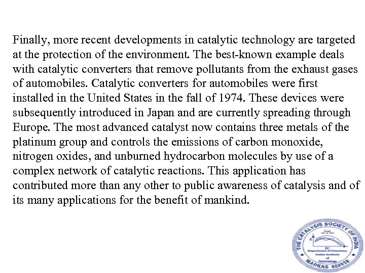 Finally, more recent developments in catalytic technology are targeted at the protection of the environment. The best-known example deals with catalytic converters that remove pollutants from the exhaust gases of automobiles. Catalytic converters for automobiles were first installed in the United States in the fall of 1974. These devices were subsequently introduced in Japan and are currently spreading through Europe. The most advanced catalyst now contains three metals of the platinum group and controls the emissions of carbon monoxide, nitrogen oxides, and unburned hydrocarbon molecules by use of a complex network of catalytic reactions. This application has contributed more than any other to public awareness of catalysis and of its many applications for the benefit of mankind.