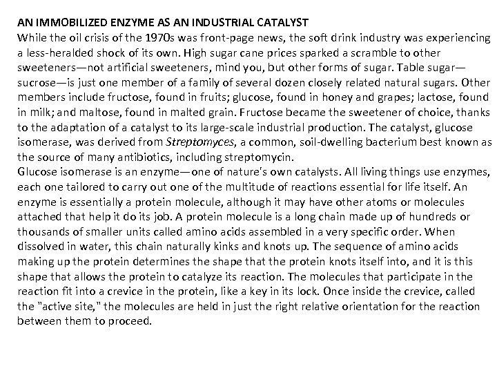 AN IMMOBILIZED ENZYME AS AN INDUSTRIAL CATALYST While the oil crisis of the 1970 s was front-page news, the soft drink industry was experiencing a less-heralded shock of its own. High sugar cane prices sparked a scramble to other sweeteners—not artificial sweeteners, mind you, but other forms of sugar. Table sugar— sucrose—is just one member of a family of several dozen closely related natural sugars. Other members include fructose, found in fruits; glucose, found in honey and grapes; lactose, found in milk; and maltose, found in malted grain. Fructose became the sweetener of choice, thanks to the adaptation of a catalyst to its large-scale industrial production. The catalyst, glucose isomerase, was derived from Streptomyces, a common, soil-dwelling bacterium best known as the source of many antibiotics, including streptomycin. Glucose isomerase is an enzyme—one of nature's own catalysts. All living things use enzymes, each one tailored to carry out one of the multitude of reactions essential for life itself. An enzyme is essentially a protein molecule, although it may have other atoms or molecules attached that help it do its job. A protein molecule is a long chain made up of hundreds or thousands of smaller units called amino acids assembled in a very specific order. When dissolved in water, this chain naturally kinks and knots up. The sequence of amino acids making up the protein determines the shape that the protein knots itself into, and it is this shape that allows the protein to catalyze its reaction. The molecules that participate in the reaction fit into a crevice in the protein, like a key in its lock. Once inside the crevice, called the "active site, " the molecules are held in just the right relative orientation for the reaction between them to proceed.