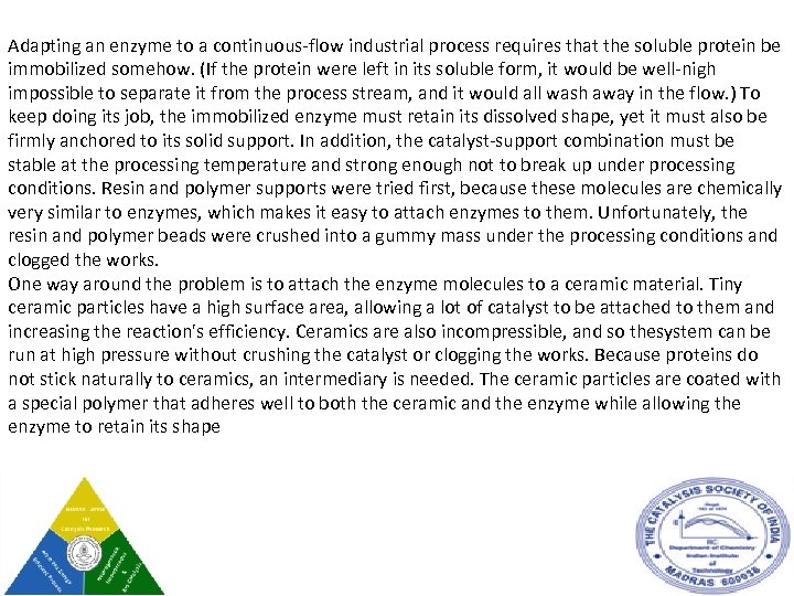 Adapting an enzyme to a continuous-flow industrial process requires that the soluble protein be immobilized somehow. (If the protein were left in its soluble form, it would be well-nigh impossible to separate it from the process stream, and it would all wash away in the flow. ) To keep doing its job, the immobilized enzyme must retain its dissolved shape, yet it must also be firmly anchored to its solid support. In addition, the catalyst-support combination must be stable at the processing temperature and strong enough not to break up under processing conditions. Resin and polymer supports were tried first, because these molecules are chemically very similar to enzymes, which makes it easy to attach enzymes to them. Unfortunately, the resin and polymer beads were crushed into a gummy mass under the processing conditions and clogged the works. One way around the problem is to attach the enzyme molecules to a ceramic material. Tiny ceramic particles have a high surface area, allowing a lot of catalyst to be attached to them and increasing the reaction's efficiency. Ceramics are also incompressible, and so thesystem can be run at high pressure without crushing the catalyst or clogging the works. Because proteins do not stick naturally to ceramics, an intermediary is needed. The ceramic particles are coated with a special polymer that adheres well to both the ceramic and the enzyme while allowing the enzyme to retain its shape