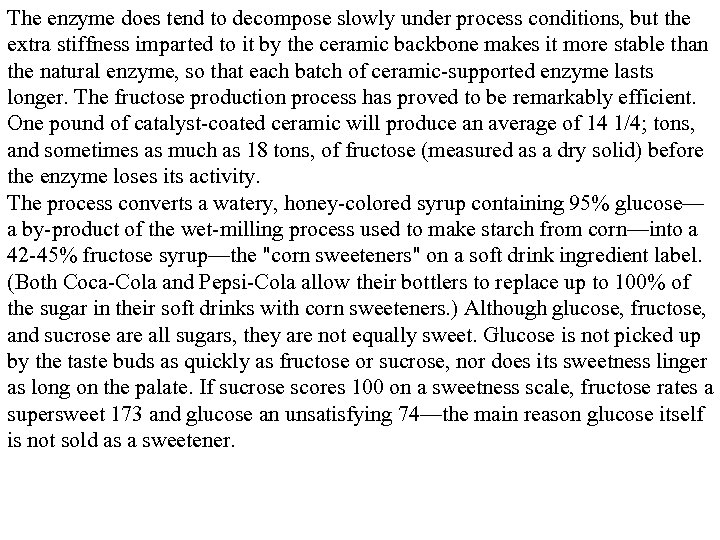 The enzyme does tend to decompose slowly under process conditions, but the extra stiffness imparted to it by the ceramic backbone makes it more stable than the natural enzyme, so that each batch of ceramic-supported enzyme lasts longer. The fructose production process has proved to be remarkably efficient. One pound of catalyst-coated ceramic will produce an average of 14 1/4; tons, and sometimes as much as 18 tons, of fructose (measured as a dry solid) before the enzyme loses its activity. The process converts a watery, honey-colored syrup containing 95% glucose— a by-product of the wet-milling process used to make starch from corn—into a 42 -45% fructose syrup—the "corn sweeteners" on a soft drink ingredient label. (Both Coca-Cola and Pepsi-Cola allow their bottlers to replace up to 100% of the sugar in their soft drinks with corn sweeteners. ) Although glucose, fructose, and sucrose are all sugars, they are not equally sweet. Glucose is not picked up by the taste buds as quickly as fructose or sucrose, nor does its sweetness linger as long on the palate. If sucrose scores 100 on a sweetness scale, fructose rates a supersweet 173 and glucose an unsatisfying 74—the main reason glucose itself is not sold as a sweetener.