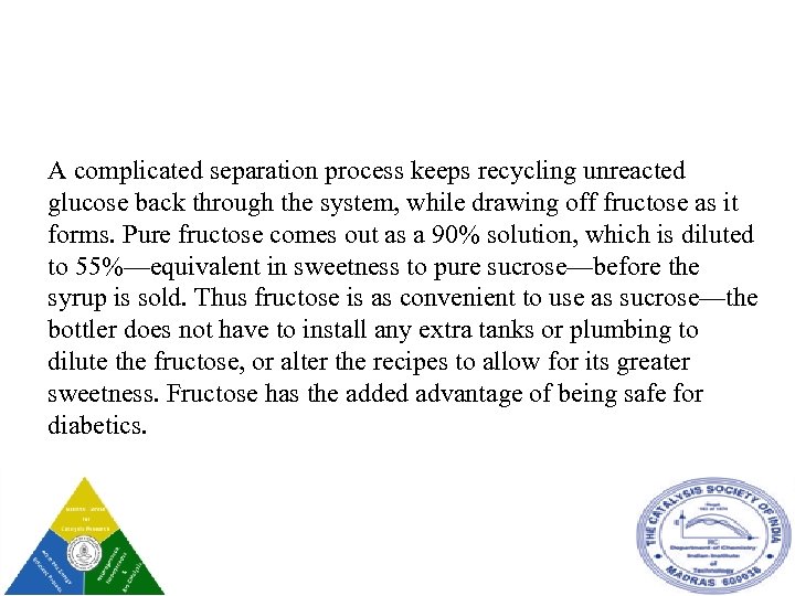 A complicated separation process keeps recycling unreacted glucose back through the system, while drawing off fructose as it forms. Pure fructose comes out as a 90% solution, which is diluted to 55%—equivalent in sweetness to pure sucrose—before the syrup is sold. Thus fructose is as convenient to use as sucrose—the bottler does not have to install any extra tanks or plumbing to dilute the fructose, or alter the recipes to allow for its greater sweetness. Fructose has the added advantage of being safe for diabetics.
