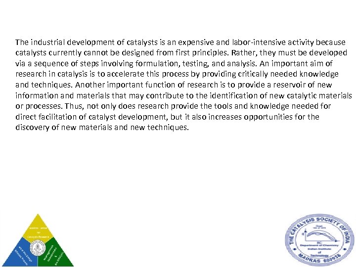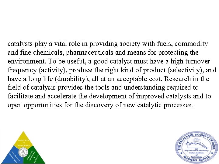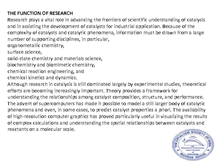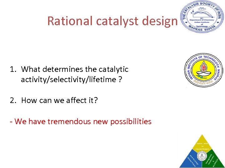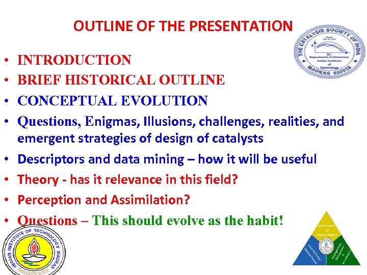 OUTLINE OF THE PRESENTATION • • INTRODUCTION BRIEF HISTORICAL OUTLINE CONCEPTUAL EVOLUTION Questions, Enigmas, Illusions, challenges, realities, and emergent strategies of design of catalysts Descriptors and data mining – how it will be useful Theory - has it relevance in this field? Perception and Assimilation? Questions – This should evolve as the habit!