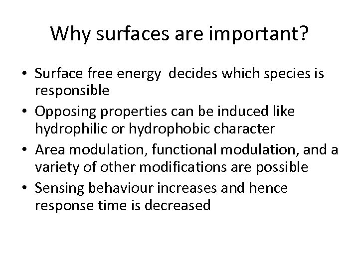 Why surfaces are important? • Surface free energy decides which species is responsible • Opposing properties can be induced like hydrophilic or hydrophobic character • Area modulation, functional modulation, and a variety of other modifications are possible • Sensing behaviour increases and hence response time is decreased