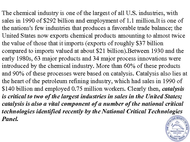 The chemical industry is one of the largest of all U. S. industries, with sales in 1990 of $292 billion and employment of 1. 1 million. It is one of the nations's few industries that produces a favorable trade balance; the United States now exports chemical products amounting to almost twice the value of those that it imports (exports of roughly $37 billion compared to imports valued at about $21 billion). Between 1930 and the early 1980 s, 63 major products and 34 major process innovations were introduced by the chemical industry. More than 60% of these products and 90% of these processes were based on catalysis. Catalysis also lies at the heart of the petroleum refining industry, which had sales in 1990 of $140 billion and employed 0. 75 million workers. Clearly then, catalysis is critical to two of the largest industries in sales in the United States; catalysis is also a vital component of a number of the national critical technologies identified recently by the National Critical Technologies Panel.