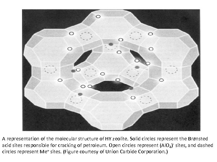 A representation of the molecular structure of HY zeolite. Solid circles represent the Brønsted acid sites responsible for cracking of petroleum. Open circles represent (Al. O 4)- sites, and dashed circles represent Me+ sites. (Figure courtesy of Union Carbide Corporation. )
