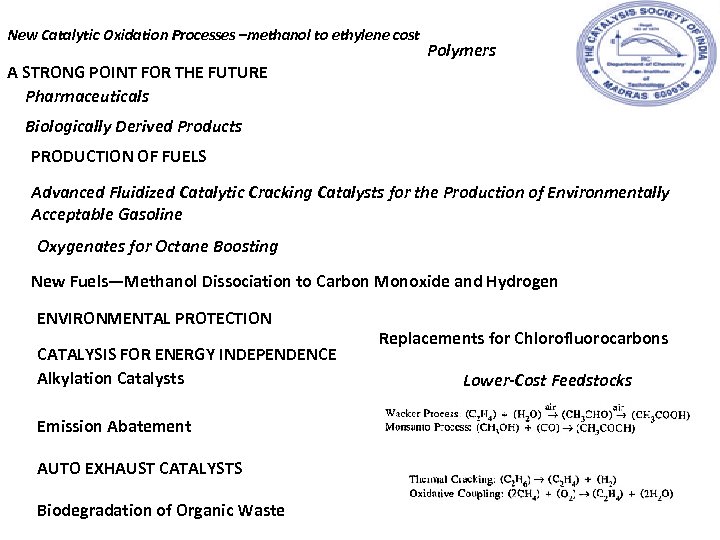 New Catalytic Oxidation Processes –methanol to ethylene cost A STRONG POINT FOR THE FUTURE Pharmaceuticals Polymers Biologically Derived Products PRODUCTION OF FUELS Advanced Fluidized Catalytic Cracking Catalysts for the Production of Environmentally Acceptable Gasoline Oxygenates for Octane Boosting New Fuels—Methanol Dissociation to Carbon Monoxide and Hydrogen ENVIRONMENTAL PROTECTION CATALYSIS FOR ENERGY INDEPENDENCE Alkylation Catalysts Emission Abatement AUTO EXHAUST CATALYSTS Biodegradation of Organic Waste Replacements for Chlorofluorocarbons Lower-Cost Feedstocks