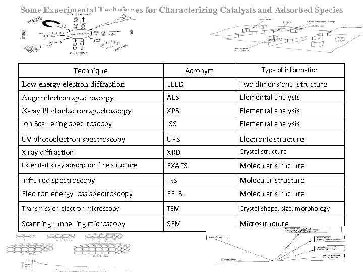 Some Experimental Techniques for Characterizing Catalysts and Adsorbed Species Technique Acronym Type of information Low energy electron diffraction LEED Two dimensional structure Auger electron spectroscopy AES Elemental analysis X-ray Photoelectron spectroscopy XPS Elemental analysis Ion Scattering spectroscopy ISS Elemental analysis UV photoelectron spectroscopy UPS Electronic structure X ray diffraction XRD Crystal structure Extended x ray absorption fine structure EXAFS Molecular structure Infra red spectroscopy IRS Molecular structure Electron energy loss spectroscopy EELS Molecular structure Transmission electron microscopy TEM Crystal shape, size, morphology Scanning tunnelling microscopy SEM Microstructure