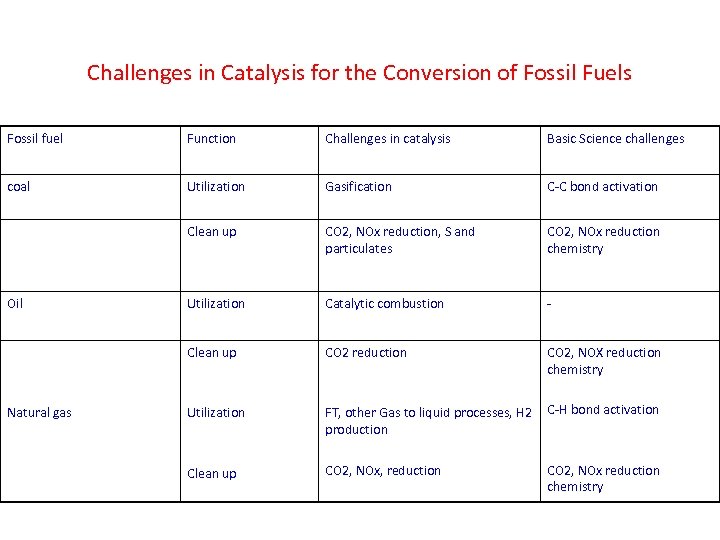 Challenges in Catalysis for the Conversion of Fossil Fuels Fossil fuel Function Challenges in catalysis Basic Science challenges coal Utilization Gasification C-C bond activation Clean up CO 2, NOx reduction, S and particulates CO 2, NOx reduction chemistry Utilization Catalytic combustion - Clean up CO 2 reduction CO 2, NOX reduction chemistry Utilization FT, other Gas to liquid processes, H 2 C-H bond activation production Clean up CO 2, NOx, reduction Oil Natural gas CO 2, NOx reduction chemistry