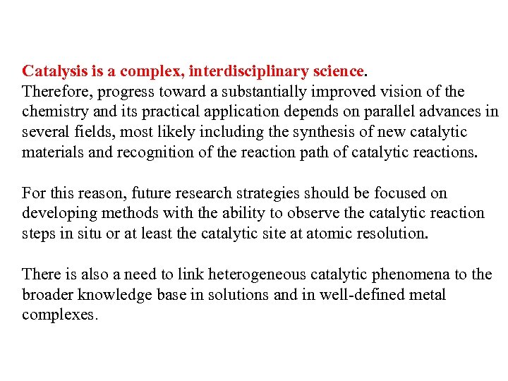 Catalysis is a complex, interdisciplinary science. Therefore, progress toward a substantially improved vision of the chemistry and its practical application depends on parallel advances in several fields, most likely including the synthesis of new catalytic materials and recognition of the reaction path of catalytic reactions. For this reason, future research strategies should be focused on developing methods with the ability to observe the catalytic reaction steps in situ or at least the catalytic site at atomic resolution. There is also a need to link heterogeneous catalytic phenomena to the broader knowledge base in solutions and in well-defined metal complexes.