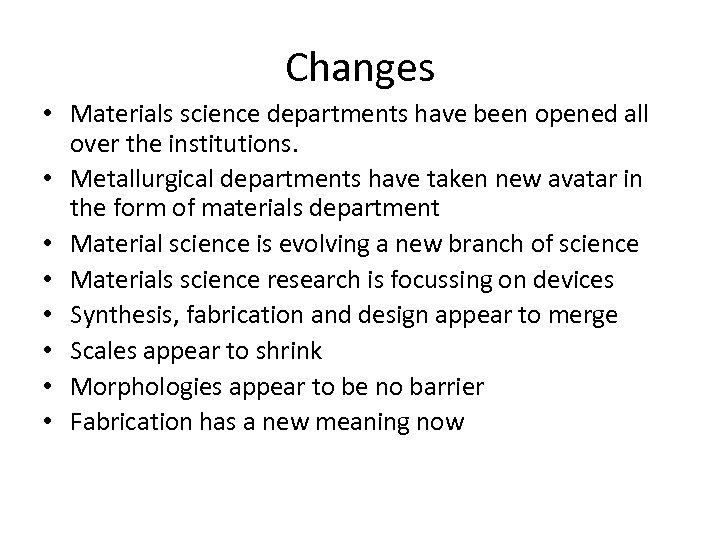 Changes • Materials science departments have been opened all over the institutions. • Metallurgical departments have taken new avatar in the form of materials department • Material science is evolving a new branch of science • Materials science research is focussing on devices • Synthesis, fabrication and design appear to merge • Scales appear to shrink • Morphologies appear to be no barrier • Fabrication has a new meaning now