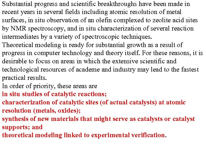 Substantial progress and scientific breakthroughs have been made in recent years in several fields including atomic resolution of metal surfaces, in situ observation of an olefin complexed to zeolite acid sites by NMR spectroscopy, and in situ characterization of several reaction intermediates by a variety of spectroscopic techniques. Theoretical modeling is ready for substantial growth as a result of progress in computer technology and theory itself. For these reasons, it is desirable to focus on areas in which the extensive scientific and technological resources of academe and industry may lead to the fastest practical results. In order of priority, these areas are in situ studies of catalytic reactions; characterization of catalytic sites (of actual catalysts) at atomic resolution (metals, oxides); synthesis of new materials that might serve as catalysts or catalyst supports; and theoretical modeling linked to experimental verification.