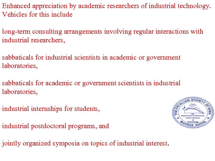 Enhanced appreciation by academic researchers of industrial technology. Vehicles for this include long-term consulting arrangements involving regular interactions with industrial researchers, sabbaticals for industrial scientists in academic or government laboratories, sabbaticals for academic or government scientists in industrial laboratories, industrial internships for students, industrial postdoctoral programs, and jointly organized symposia on topics of industrial interest.