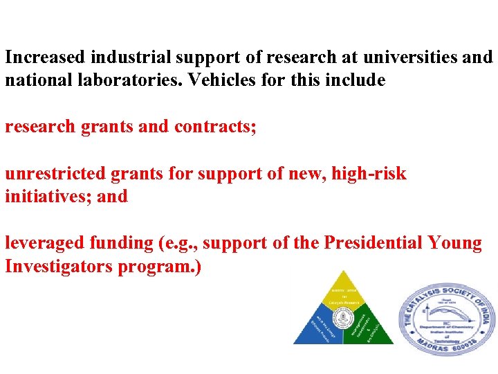 Increased industrial support of research at universities and national laboratories. Vehicles for this include research grants and contracts; unrestricted grants for support of new, high-risk initiatives; and leveraged funding (e. g. , support of the Presidential Young Investigators program. )