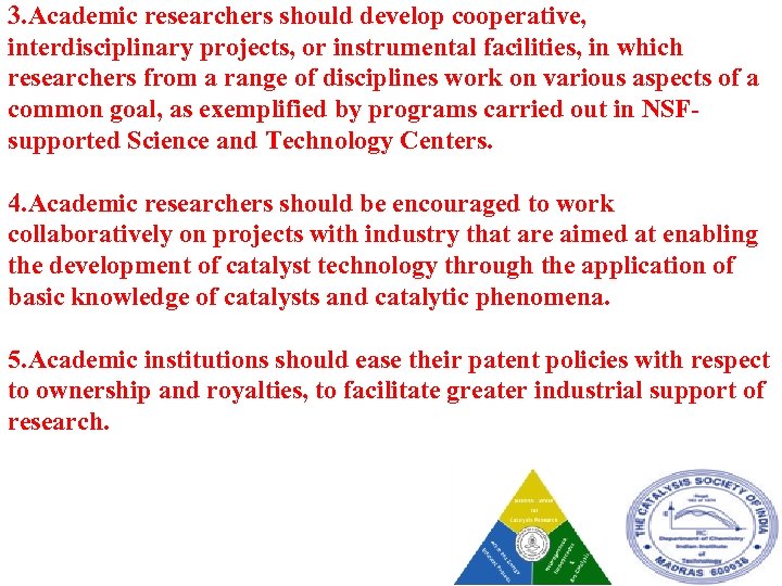 3. Academic researchers should develop cooperative, interdisciplinary projects, or instrumental facilities, in which researchers from a range of disciplines work on various aspects of a common goal, as exemplified by programs carried out in NSFsupported Science and Technology Centers. 4. Academic researchers should be encouraged to work collaboratively on projects with industry that are aimed at enabling the development of catalyst technology through the application of basic knowledge of catalysts and catalytic phenomena. 5. Academic institutions should ease their patent policies with respect to ownership and royalties, to facilitate greater industrial support of research.