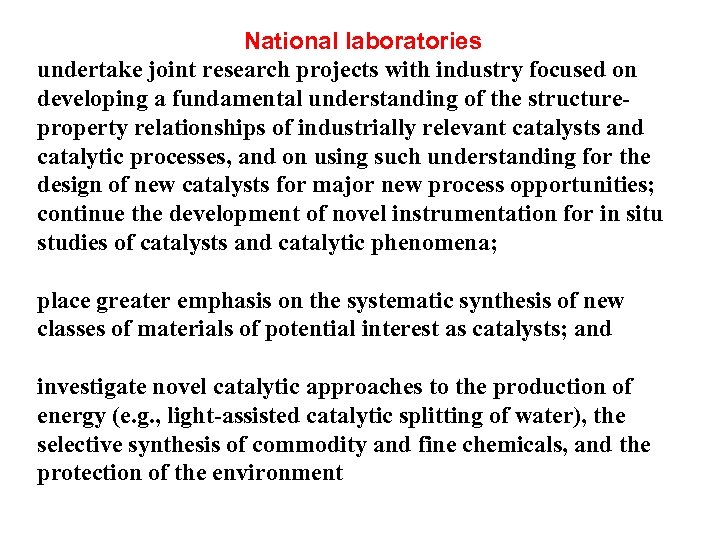 National laboratories undertake joint research projects with industry focused on developing a fundamental understanding of the structureproperty relationships of industrially relevant catalysts and catalytic processes, and on using such understanding for the design of new catalysts for major new process opportunities; continue the development of novel instrumentation for in situ studies of catalysts and catalytic phenomena; place greater emphasis on the systematic synthesis of new classes of materials of potential interest as catalysts; and investigate novel catalytic approaches to the production of energy (e. g. , light-assisted catalytic splitting of water), the selective synthesis of commodity and fine chemicals, and the protection of the environment
