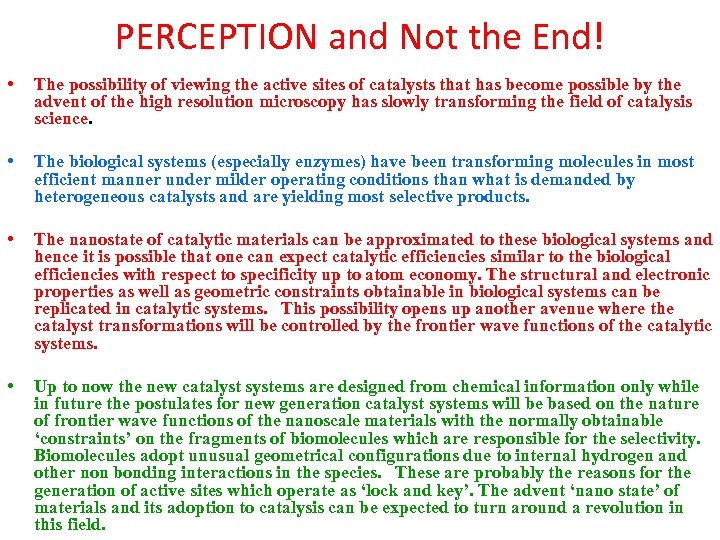 PERCEPTION and Not the End! • The possibility of viewing the active sites of catalysts that has become possible by the advent of the high resolution microscopy has slowly transforming the field of catalysis science. • The biological systems (especially enzymes) have been transforming molecules in most efficient manner under milder operating conditions than what is demanded by heterogeneous catalysts and are yielding most selective products. • The nanostate of catalytic materials can be approximated to these biological systems and hence it is possible that one can expect catalytic efficiencies similar to the biological efficiencies with respect to specificity up to atom economy. The structural and electronic properties as well as geometric constraints obtainable in biological systems can be replicated in catalytic systems. This possibility opens up another avenue where the catalyst transformations will be controlled by the frontier wave functions of the catalytic systems. • Up to now the new catalyst systems are designed from chemical information only while in future the postulates for new generation catalyst systems will be based on the nature of frontier wave functions of the nanoscale materials with the normally obtainable ‘constraints’ on the fragments of biomolecules which are responsible for the selectivity. Biomolecules adopt unusual geometrical configurations due to internal hydrogen and other non bonding interactions in the species. These are probably the reasons for the generation of active sites which operate as ‘lock and key’. The advent ‘nano state’ of materials and its adoption to catalysis can be expected to turn around a revolution in this field.