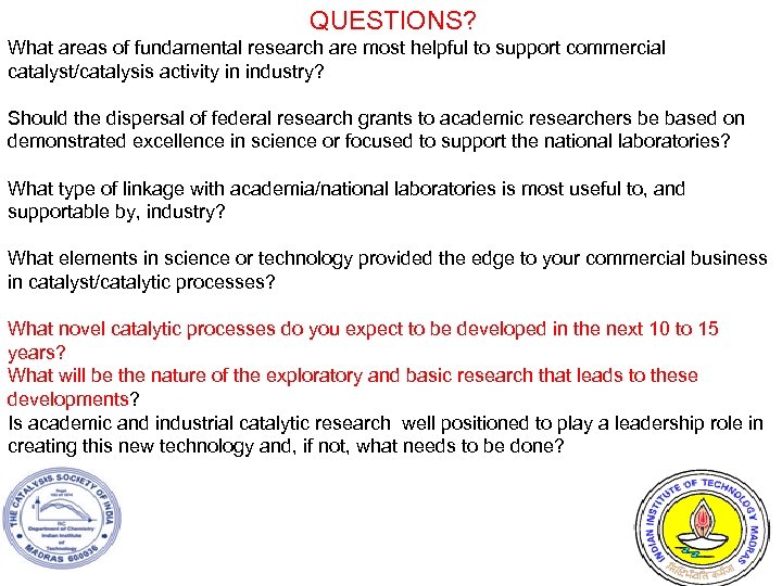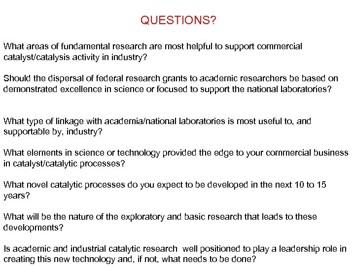 QUESTIONS? What areas of fundamental research are most helpful to support commercial catalyst/catalysis activity in industry? Should the dispersal of federal research grants to academic researchers be based on demonstrated excellence in science or focused to support the national laboratories? What type of linkage with academia/national laboratories is most useful to, and supportable by, industry? What elements in science or technology provided the edge to your commercial business in catalyst/catalytic processes? What novel catalytic processes do you expect to be developed in the next 10 to 15 years? What will be the nature of the exploratory and basic research that leads to these developments? Is academic and industrial catalytic research well positioned to play a leadership role in creating this new technology and, if not, what needs to be done?