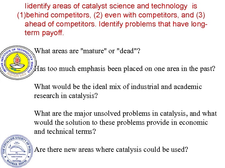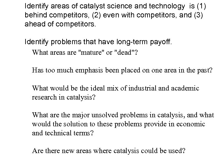 Iidentify areas of catalyst science and technology is (1)behind competitors, (2) even with competitors, and (3) ahead of competitors. Identify problems that have longterm payoff. What areas are ''mature'' or "dead"? Has too much emphasis been placed on one area in the past? What would be the ideal mix of industrial and academic research in catalysis? What are the major unsolved problems in catalysis, and what would the solution to these problems provide in economic and technical terms? Are there new areas where catalysis could be used?