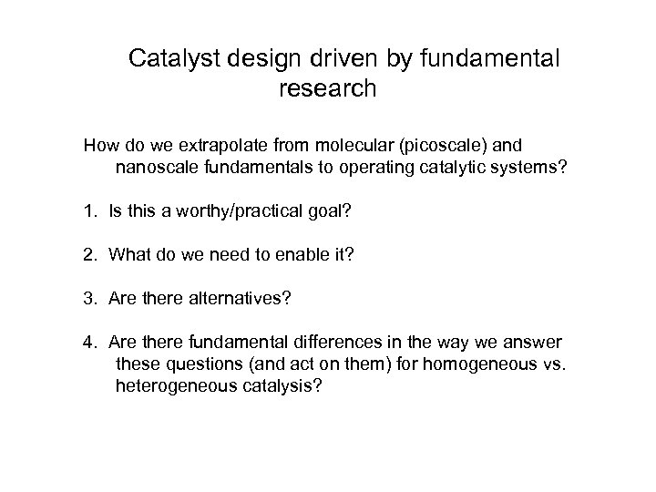 Catalyst design driven by fundamental research How do we extrapolate from molecular (picoscale) and nanoscale fundamentals to operating catalytic systems? 1. Is this a worthy/practical goal? 2. What do we need to enable it? 3. Are there alternatives? 4. Are there fundamental differences in the way we answer these questions (and act on them) for homogeneous vs. heterogeneous catalysis?