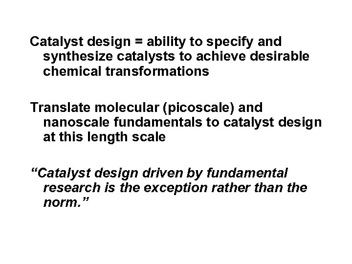 Catalyst design = ability to specify and synthesize catalysts to achieve desirable chemical transformations Translate molecular (picoscale) and nanoscale fundamentals to catalyst design at this length scale “Catalyst design driven by fundamental research is the exception rather than the norm. ”