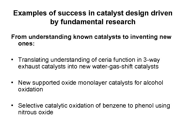 Examples of success in catalyst design driven by fundamental research From understanding known catalysts to inventing new ones: • Translating understanding of ceria function in 3 -way exhaust catalysts into new water-gas-shift catalysts • New supported oxide monolayer catalysts for alcohol oxidation • Selective catalytic oxidation of benzene to phenol using nitrous oxide