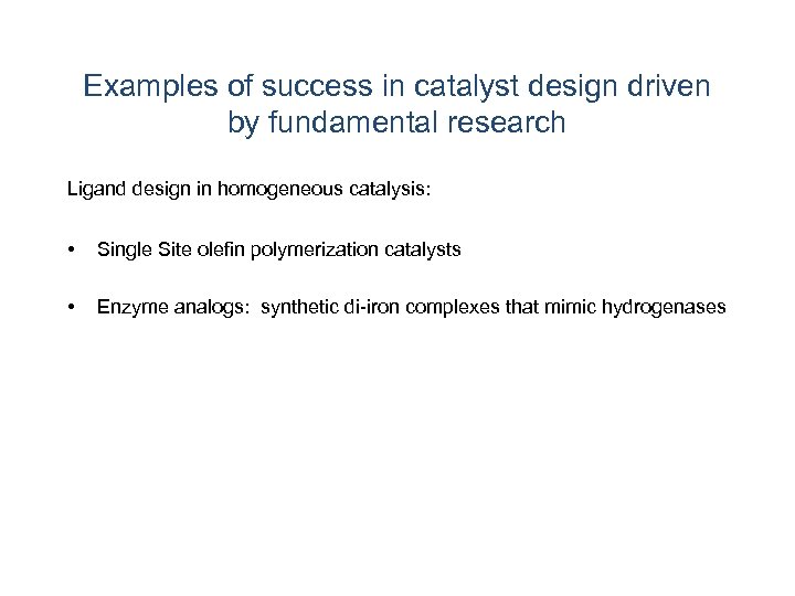 Examples of success in catalyst design driven by fundamental research Ligand design in homogeneous catalysis: • Single Site olefin polymerization catalysts • Enzyme analogs: synthetic di-iron complexes that mimic hydrogenases