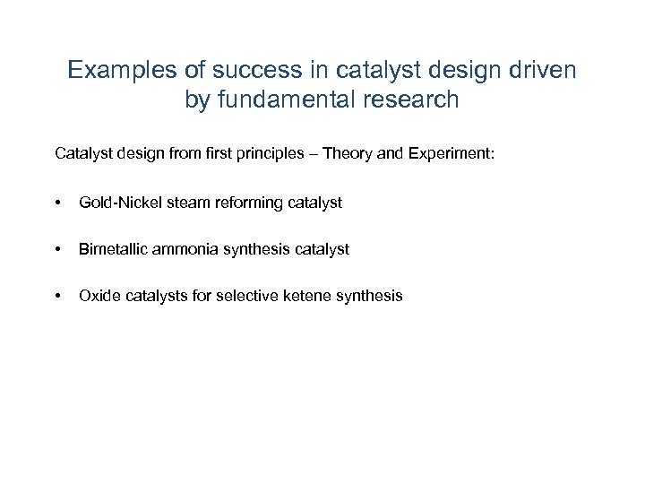 Examples of success in catalyst design driven by fundamental research Catalyst design from first principles – Theory and Experiment: • Gold-Nickel steam reforming catalyst • Bimetallic ammonia synthesis catalyst • Oxide catalysts for selective ketene synthesis