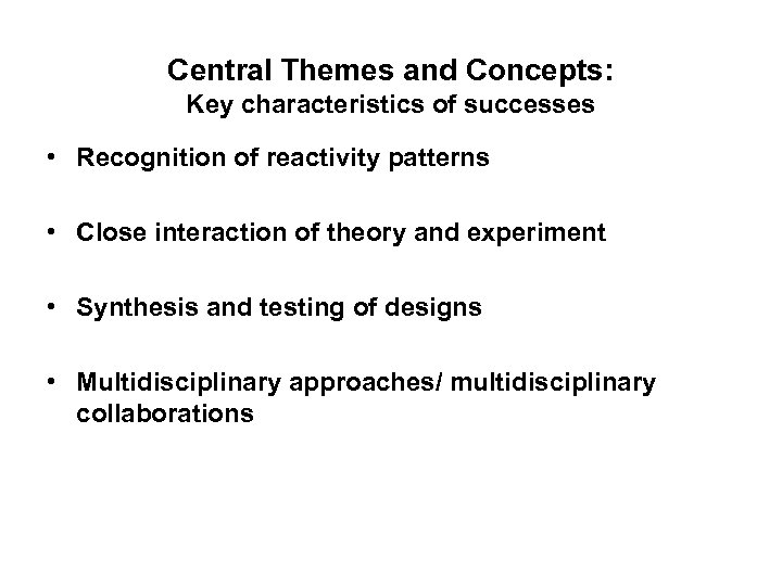 Central Themes and Concepts: Key characteristics of successes • Recognition of reactivity patterns • Close interaction of theory and experiment • Synthesis and testing of designs • Multidisciplinary approaches/ multidisciplinary collaborations