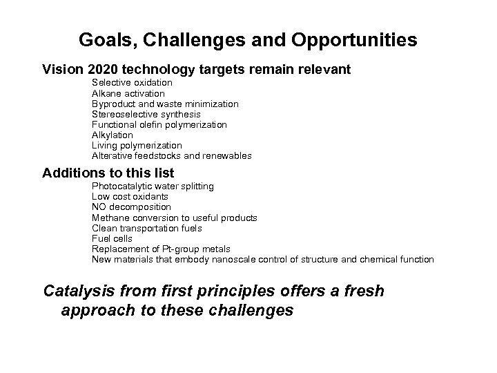 Goals, Challenges and Opportunities Vision 2020 technology targets remain relevant Selective oxidation Alkane activation Byproduct and waste minimization Stereoselective synthesis Functional olefin polymerization Alkylation Living polymerization Alterative feedstocks and renewables Additions to this list Photocatalytic water splitting Low cost oxidants NO decomposition Methane conversion to useful products Clean transportation fuels Fuel cells Replacement of Pt-group metals New materials that embody nanoscale control of structure and chemical function Catalysis from first principles offers a fresh approach to these challenges