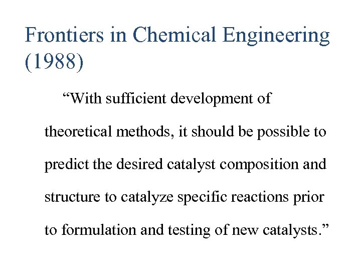 Frontiers in Chemical Engineering (1988) “With sufficient development of theoretical methods, it should be possible to predict the desired catalyst composition and structure to catalyze specific reactions prior to formulation and testing of new catalysts. ”